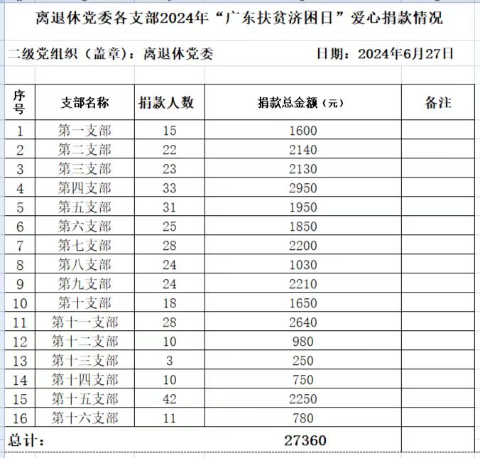 根据学校《关于开展2024年“广东扶贫济困日”爱心捐款活动的通知》(党政办〔2024〕7号)的要求,离退休党委于6月24日至6月26日组织以支部为单位进行捐款,各党支部和党员积极响应,踊跃捐款,共捐款27360元。现将捐款情况公示如下: