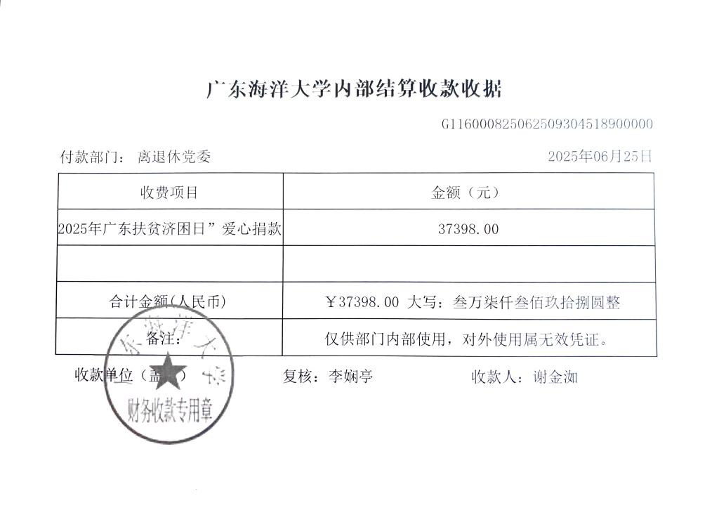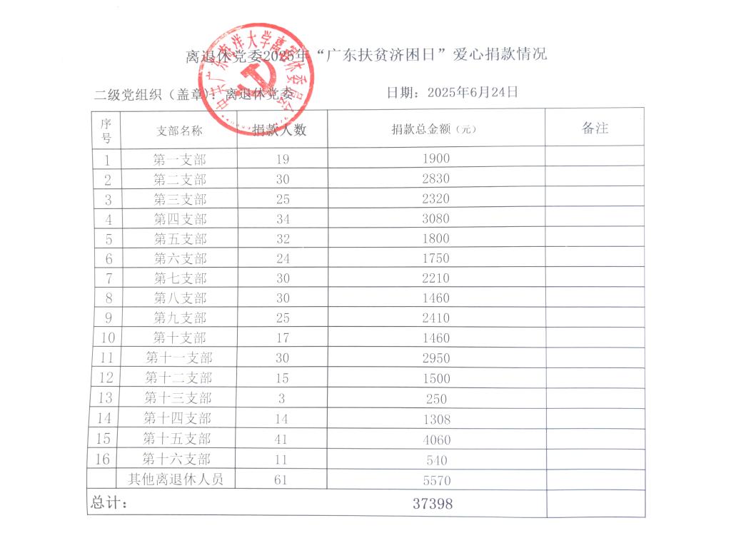 根据学校《关于开展2025年“广东扶贫济困日”爱心捐款活动的通知》文件的要求,离退休党委于6月19日至6月23日组织发动捐款,各党支部党员和其他离退休人员积极响应,踊跃捐款,共捐款37398元。现将捐款情况公示如下: